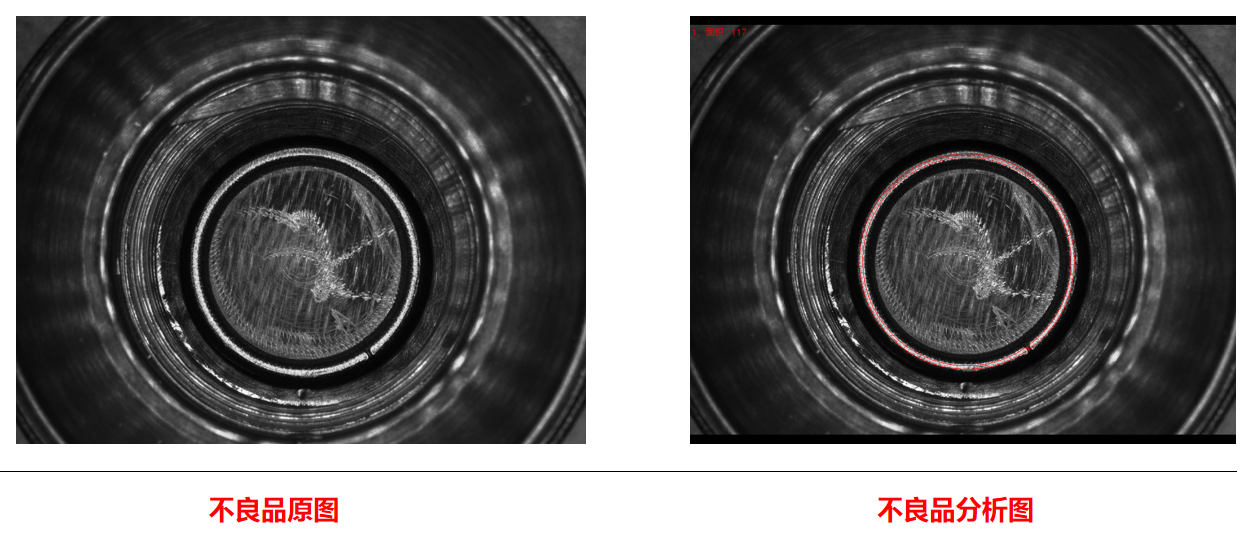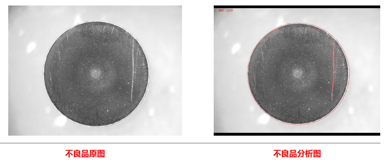 相機1頂部正光檢測不良品分析圖:NG 結(jié)論:可檢 檢測特征:頂部劃傷